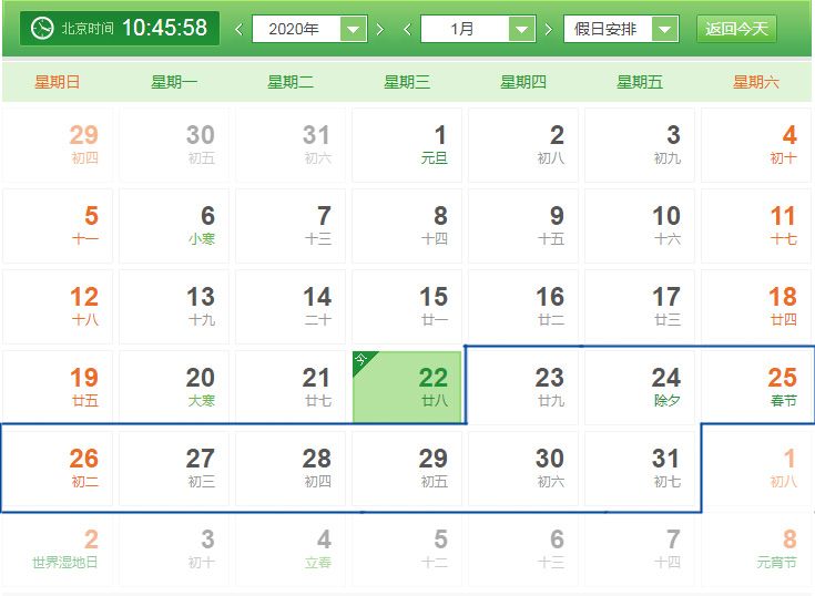 2020年春節期間,我公司放假時間為2020年1月23日(農歷臘月二十九)至2020年1月31日(農歷正月初七),2020年2月1日(農歷正月初八)開始上班。春節放假期間,我公司暫停生產和服務工作,如有特殊事務請聯系我公司相關工作人員,帶來不便請您諒解。